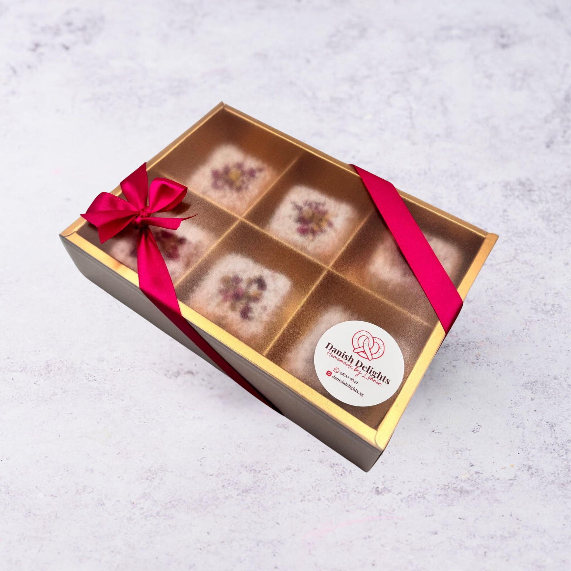 A moist gluten-free almond cake flavoured with pistachios, cardamom, rose water and almonds. Topped with rose petals. The name "Love Cake" reflects the romantic legend behind its creation, making it not just a dessert but a symbol of affection and sweet indulgence..