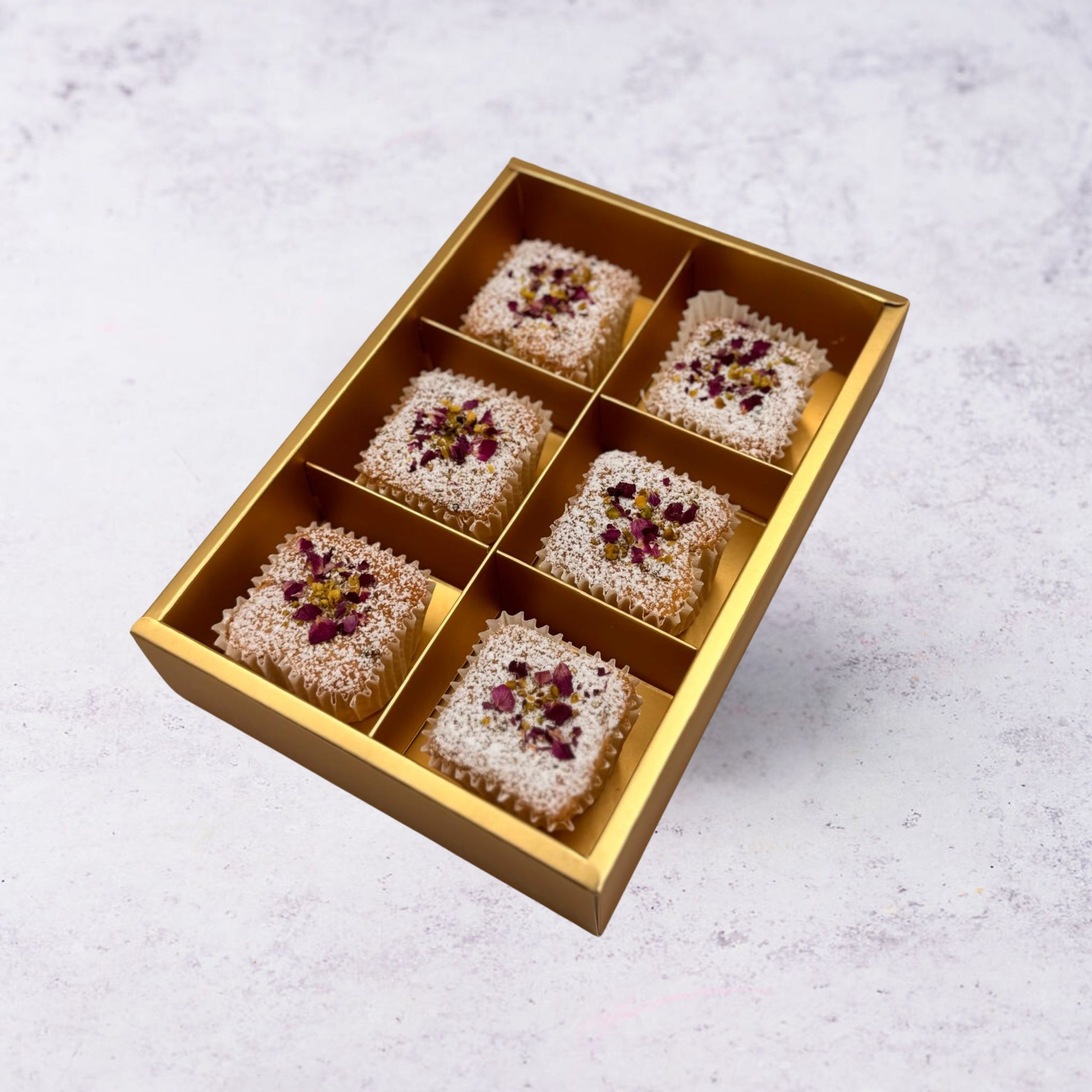 Ingredients: Almond flour, coconut, rose water, cardamom, pistachios, sugar, eggs, and butter